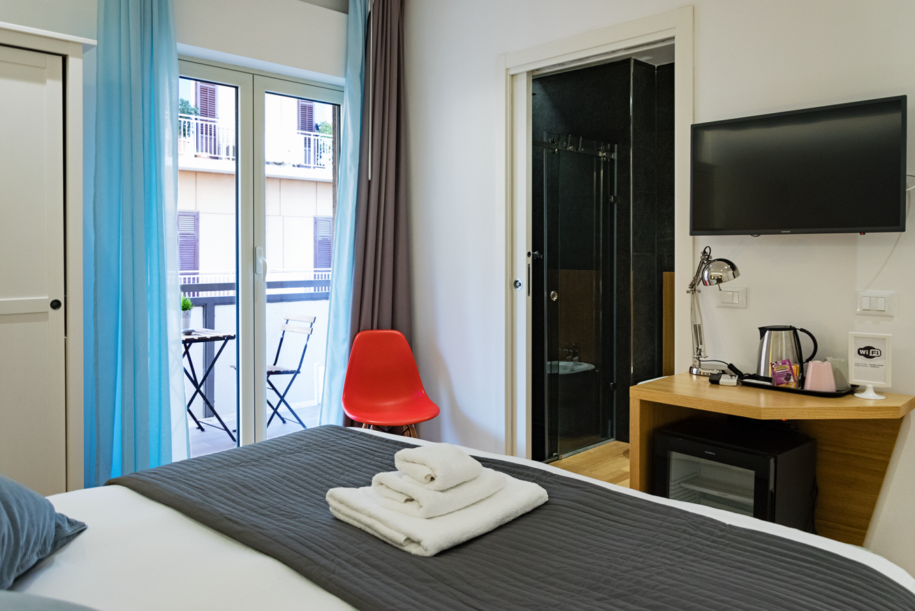 Un'ambiente fresco e colorato offre servizi di comfort,, minibar, bagno interno, kit di cortesia ed un balcone con vista dell'autentico Teatro Politeama.